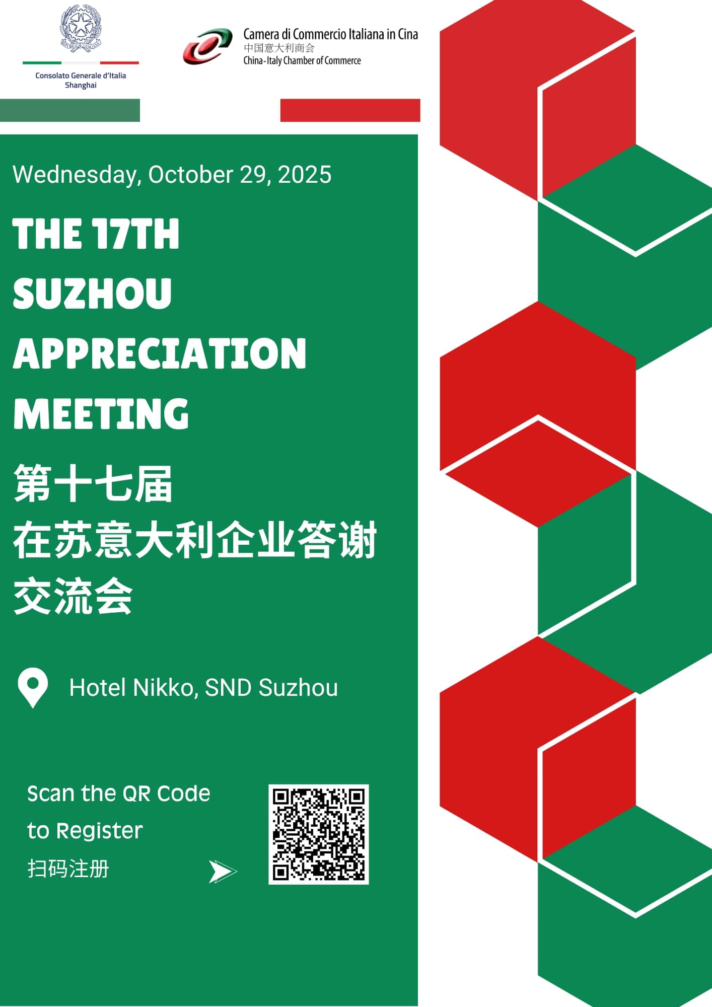 The China-Italy Chamber of Commerce (CICC), in collaboration with the Foreign Affairs Office of the Suzhou Municipal Government, and with the support of the Embassy of Italy to the P.R.C. and the Consulate General of Italy in Shanghai, is organizing the 17th Suzhou Appreciation Meeting.
