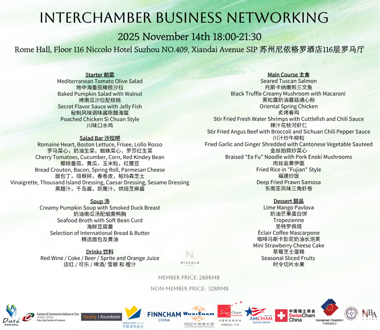 The China-Italy Chamber of Commerce (CICC), in collaboration with DUSA European Association Suzhou, SwedCham China, SwissCham China, FinnCham China, WuxiCham, Singapore Chamber of Commerce Jiangsu Chapter, and the Taicang Roundtable cordially invites you to an exclusive Interchamber Business Networking evening at the prestigious Niccolo Hotel, Suzhou.