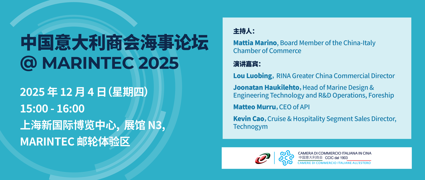 The China-Italy Chamber of Commerce (CICC) invites you to attend the seminar “Experience Italian Excellence in Cruise Shipbuilding.” The event will take place on Thursday, December 4th, 2025, from 15:00 to 16:00 at Marintec China 2025, one of Asia’s leading maritime exhibitions,  hosted at the Shanghai New International Expo Centre (SNIEC), N3. This informative seminar aims to showcase Italy’s leading expertise in cruise ship design, technology, and innovation.