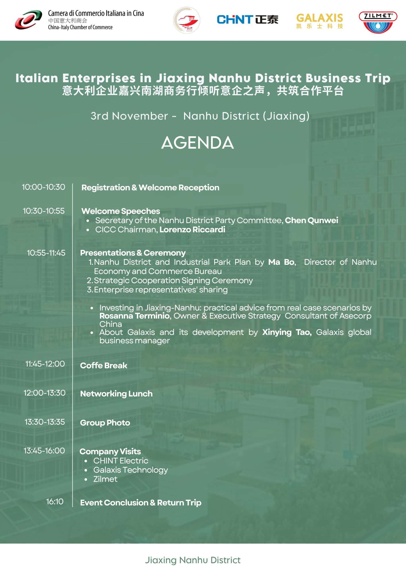 The China-Italy Chamber of Commerce (CICC) is delighted to partner with the Jiaxing Nanhu District Government to invite you to a pivotal business and networking event on Monday, November 3rd, 2025.