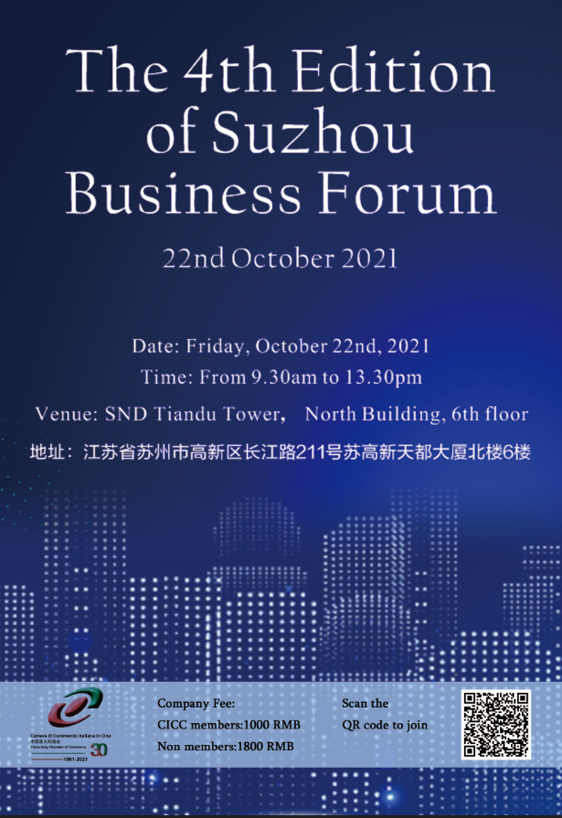 The China-Italy Chamber of Commerce is pleased to announce the Fourth Edition of Suzhou Business Forum that will be held on October 22nd, 2021 at SND Tiandu Tower.