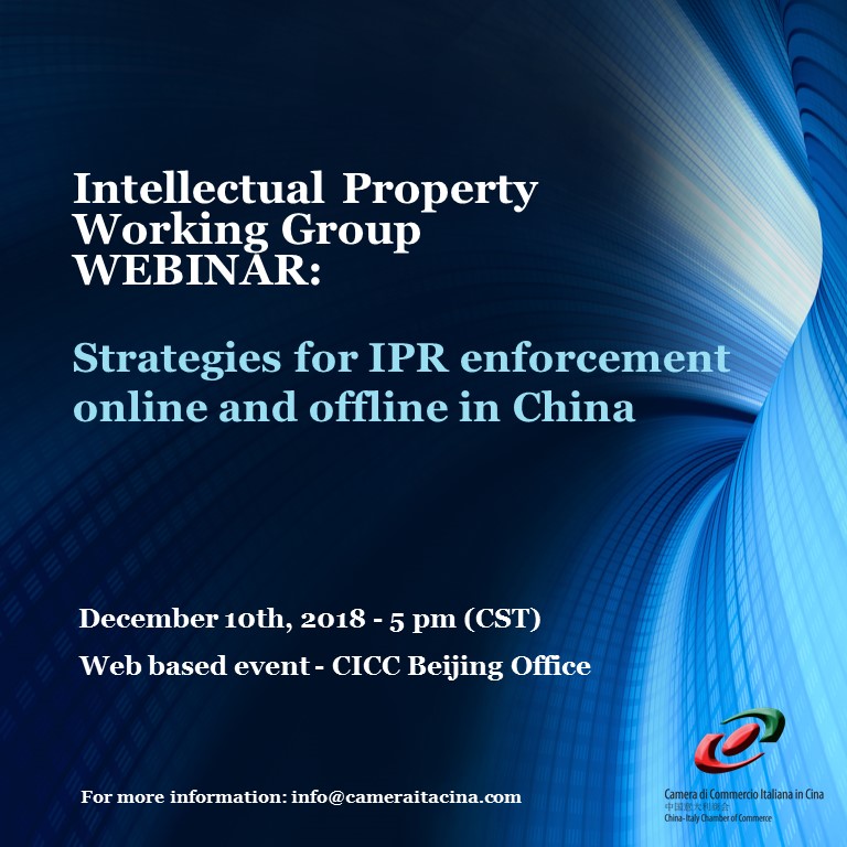 The China-Italy Chamber of Commerce is glad to invite you to the WEBINAR "Strategies for IPR enforcement online and offline in China", organized by CICC’s Intellectual Protection Working Group (IPWG).
